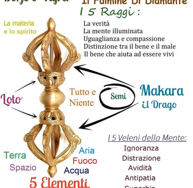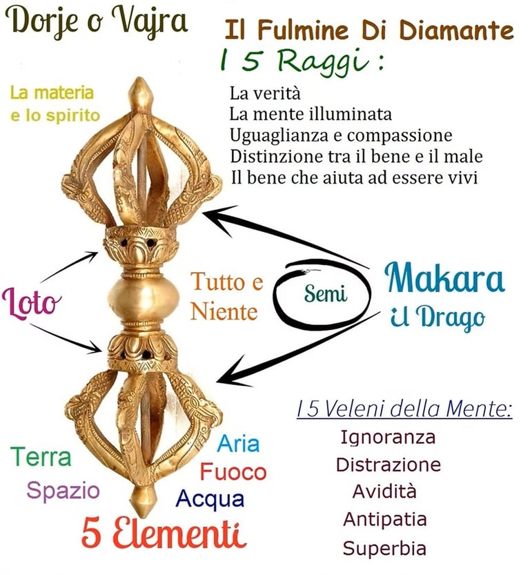 Originally the symbol of the Vedic god Indra, it represents the lightning bolt and the principle of the imperturbable male, which stands for the upaya, or method of the path, in which there are five goals that symbolize the five jiyas, or achievements: the Five Buddhas.